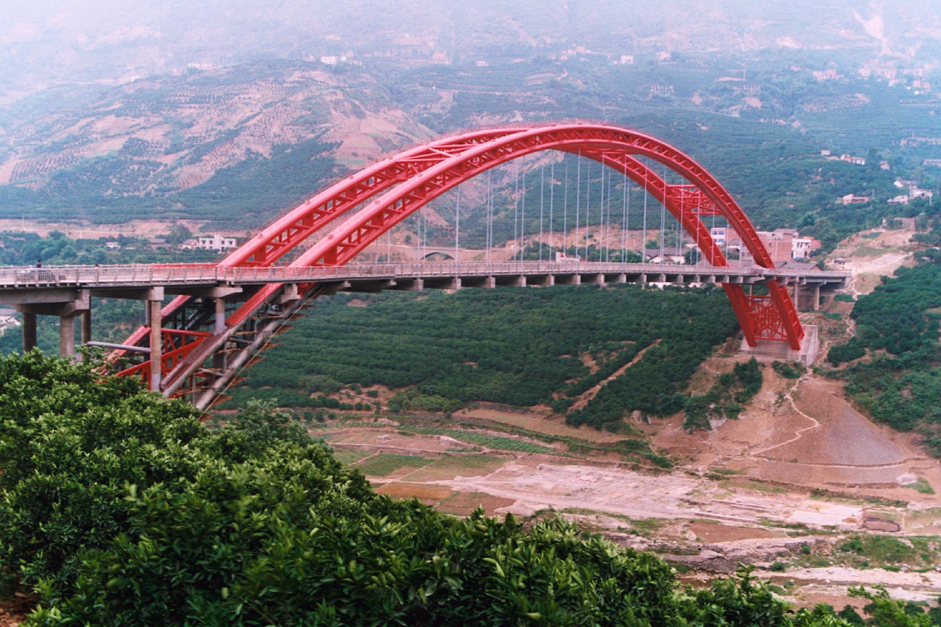 秭歸龍?zhí)逗哟髽蛭挥谥闹袊毘戎l(xiāng)----湖北秭歸縣腹地,主跨為208米的特大跨徑中承式鋼管混凝土拱橋,該橋在國內首次采用“大跨徑鋼管砼拱橋纜索吊裝塔架扣架一體化施工,獲湖北省科技進步二等獎,于2000年建成。