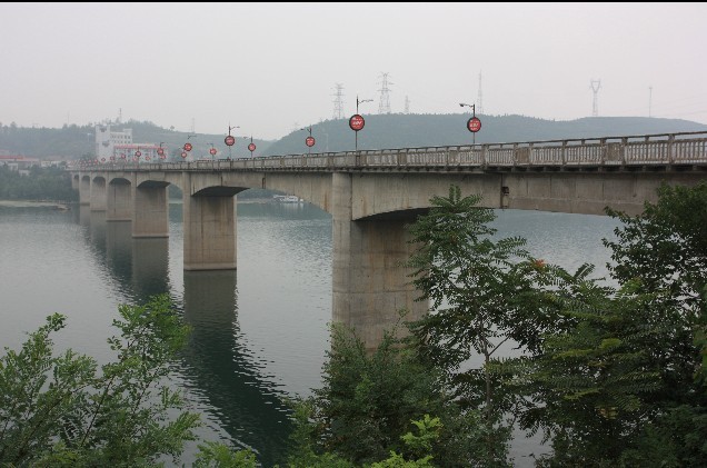 丹江口市二橋:結(jié)構(gòu)型式為(88 2*150 88)m預(yù)應(yīng)力變截面連續(xù)箱橋,深水墩最大入水深度40m,居全國同類深水墩大橋之最。2005年建成。