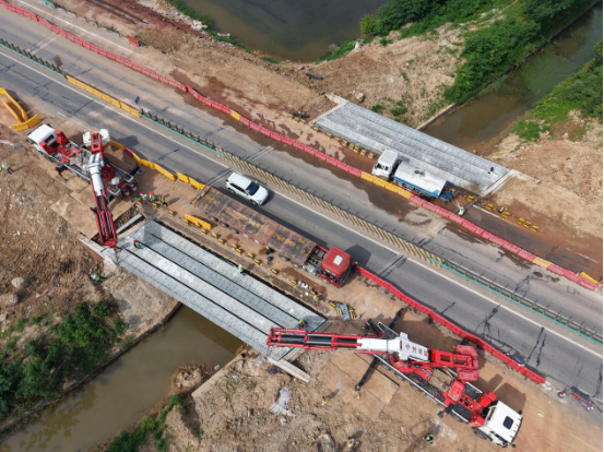 面對(duì)施工場(chǎng)地限制、高壓線路影響、邊通車邊施工等復(fù)雜難題,施工單位湖北省路橋集團(tuán)有限公司通過(guò)精密設(shè)計(jì)演算,創(chuàng)新性提出采用85t折臂吊車方案,通過(guò)減少吊車配重、壓縮車輛轉(zhuǎn)幅半徑,既滿足現(xiàn)場(chǎng)實(shí)際施工需求,又顯著提高了吊裝作業(yè)的安全性能與機(jī)動(dòng)性。同時(shí),該公司成立技術(shù)、安全、施工專項(xiàng)工作組,聯(lián)合建設(shè)單位、監(jiān)理單位構(gòu)建“三位一體”安全管控體系,安排專人配合公安交管部門引導(dǎo)交通,全過(guò)程保障碧石港橋、瑪瑙嘴橋拼寬段32片空心板吊裝作業(yè)安全。